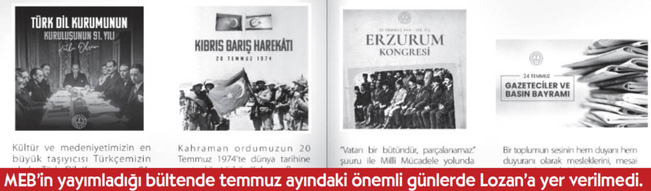Ancak kutlamalar arasında bu yıl 24 Temmuz’da 100. yılı kutlanan Lozan’a yer verilmedi. Bültende, Lozan Barış Antlaşması’na ilişkin herhangi bir ifade yer almadı.