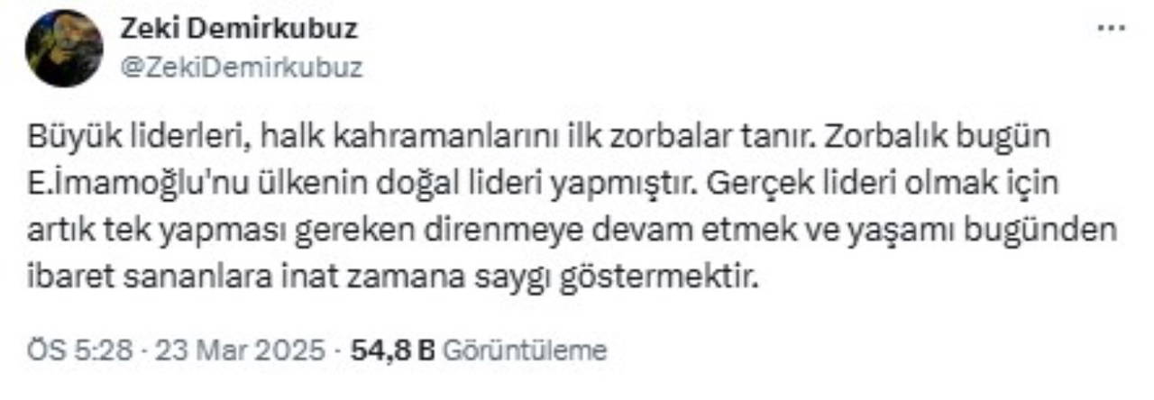"Büyük liderleri, halk kahramanlarını ilk zorbalar tanır. Zorbalık bugün Ekrem İmamoğlu'nu ülkenin doğal lideri yapmıştır. Gerçek lideri olmak için artık tek yapması gereken direnmeye devam etmek ve yaşamı bugünden ibaret sananlara inat zamana saygı göstermektir."