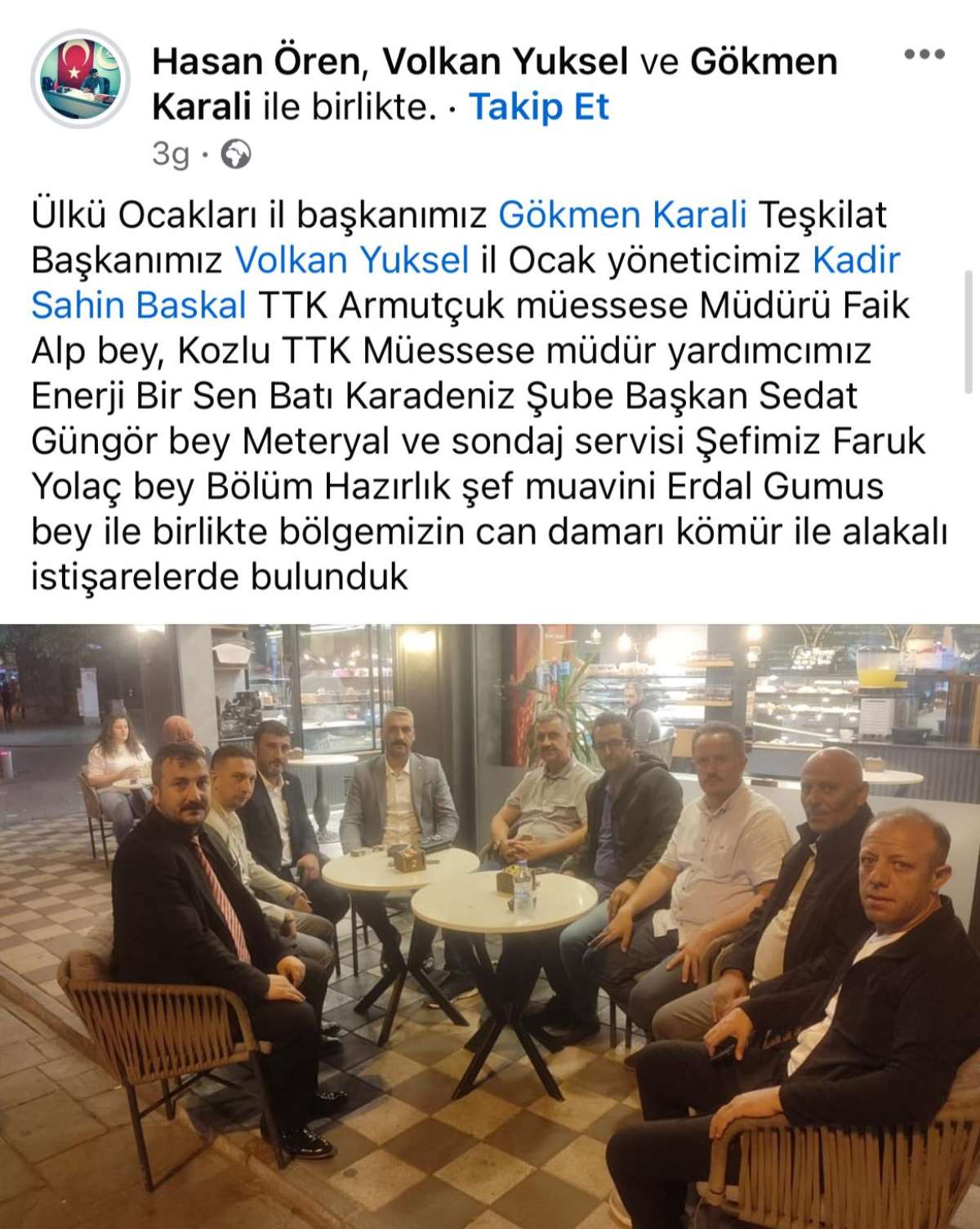 “Ülkü Ocakları il başkanımız Gökmen Karalı Teşkilat Başkanımız Volkan Yüksel il Ocak yöneticimiz Kadir Şahin Başkal TTK Armutçuk müessese Müdürü Faik Alp bey, Kozlu TTK Müessese müdür yardımcımız Enerji Bir Sen Batı Karadeniz Şube Başkan Sedat Güngör bey Meteryal ve sondaj servisi Şefimiz Faruk Yolaç bey Bölüm Hazırlık şef muavini Erdal Gümüş bey ile birlikte bölgemizin can damarı kömür ile alakalı istişarelerde bulunduk”