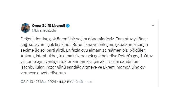 “Değerli dostlar, çok önemli bir seçim dönemindeyiz. Tam otuz yıl önce sağ-sol ayrımı çok keskindi. Bütün ikna ve birleşme çabalarıma karşın seçime üç sol parti girdi. En fazla oyu almamıza rağmen bizi böldüler. Ankara, İstanbul başta olmak üzere pek çok belediye Refah’a geçti. Otuz yıl sonra aynı yanlışın tekrarlanmaması için akl-ı selim sahibi tüm İstanbulluları Pazar günü sandığa gitmeye ve Ekrem İmamoğlu’na oy vermeye davet ediyorum.”