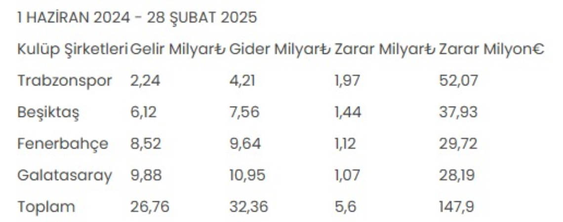 Fenerbahçe ve Galatasaray, 1 Haziran 2024 ile 28 Şubat 2025 arasındaki ilk dokuz aylık dönemde kar elde ettiklerini açıklasalar da bağımsız denetçilerin bir önceki dönemin raporları uyarınca dört kulübün toplam zararı 5,6 milyar lirayı buldu.