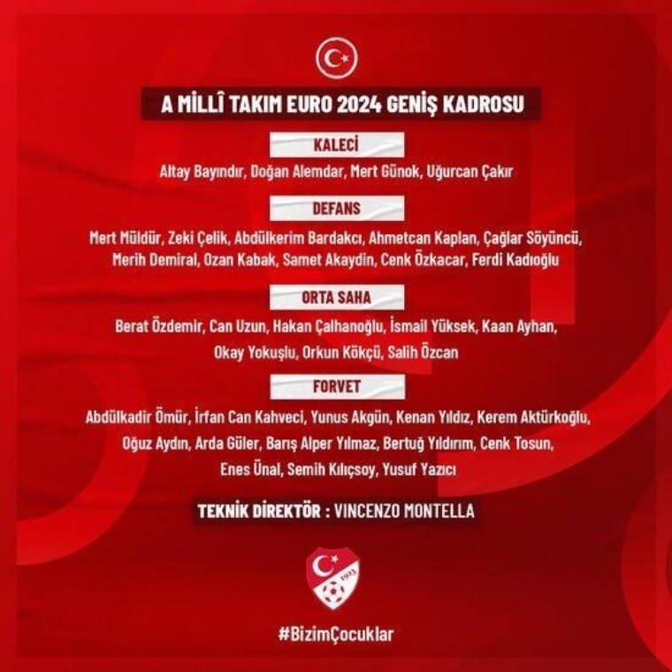 Ay-Yıldızlılar'da açıklanan geniş kadrodan Bertuğ Yıldırım, Ümitler'e geçiş yaptı. Çağlar Söyüncü, Enes Ünal ve Ozan Kabak da sakatlıkları sebebiyle kadrodan çıkarıldı. Şu anda Montella'nın elinde 31 oyuncu yer alıyor ve bunlardan en az 5 isim, EURO 2024 finallerini göremeyecek.