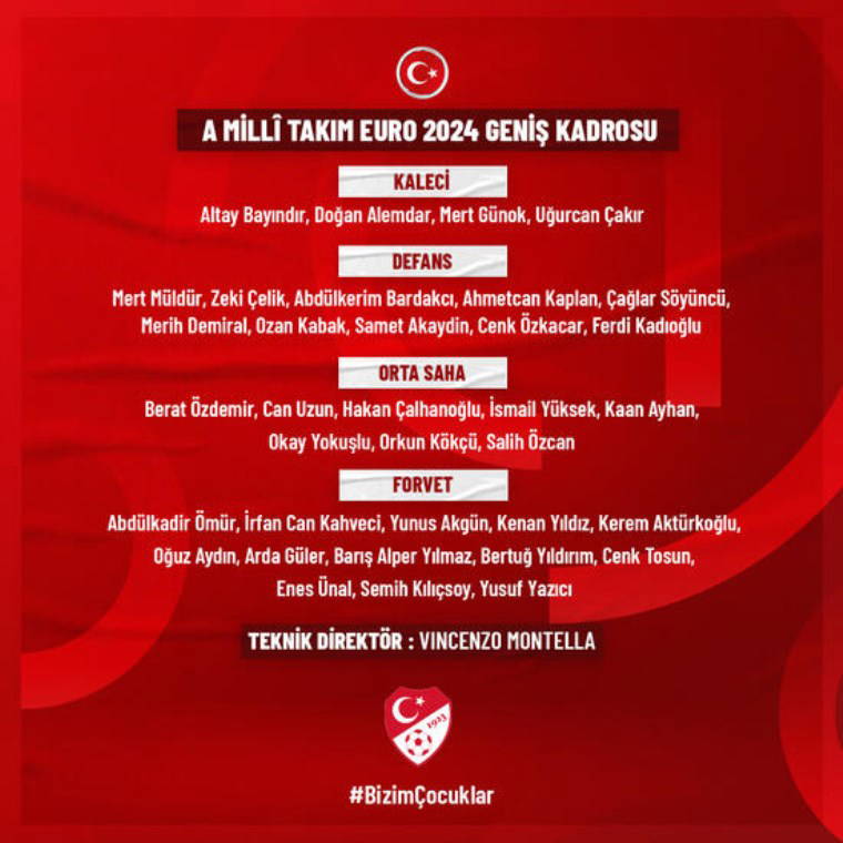 Türkiye Futbol Federasyonu'ndan yapılan açıklamada; "Almanya'nın ev sahipliğinde 14 Haziran - 14 Temmuz tarihleri arasında düzenlenecek 2024 Avrupa Şampiyonası (EURO 2024) finallerine katılacak A Milli Takımımızın geniş kadrosu açıklandı. Teknik Direktörümüz Vincenzo Montella tarafından belirlenen listede 35 futbolcu bulunuyor." ifadeleri kullanıldı.