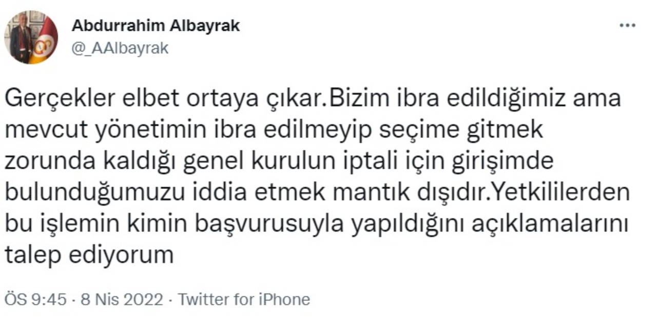 Albayrak sosyal medya hesabından yaptığı paylaşımda, "Gerçekler elbet ortaya çıkar. Bizim ibra edildiğimiz ama mevcut yönetimin ibra edilmeyip seçime gitmek zorunda kaldığı genel kurulun iptali için girişimde bulunduğumuzu iddia etmek mantık dışıdır. Yetkililerden bu işlemin kimin başvurusuyla yapıldığını açıklamalarını talep ediyorum" ifadelerini kullandı.