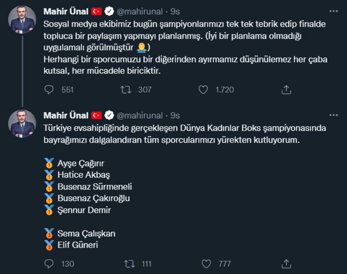 AKP’li Ünal bir sonraki paylaşımında altın ve bronz madalya alan sporcuların isimlerini yazarak, “Türkiye ev sahipliğinde gerçekleşen Dünya Kadınlar Boks şampiyonasında bayrağımızı dalgalandıran tüm sporcularımızı yürekten kutluyorum” mesajını paylaştı.