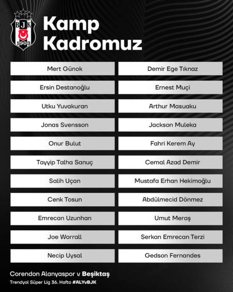 Üst solunum yolu enfeksiyonu geçiren futbolcumuz Alex Chamberlain ile alt karın bölgesinde ağrısı olan ve yapılan değerlendirmesinde atletik pubalji saptanan futbolcumuz Vincent Aboubakar, Corendon Alanyaspor maçı kadrosunda bulunmayacaktır. Futbolcularımızın tedavisine sağlık ekibimiz tarafından başlanmıştır" ifadeleri kullanıldı.