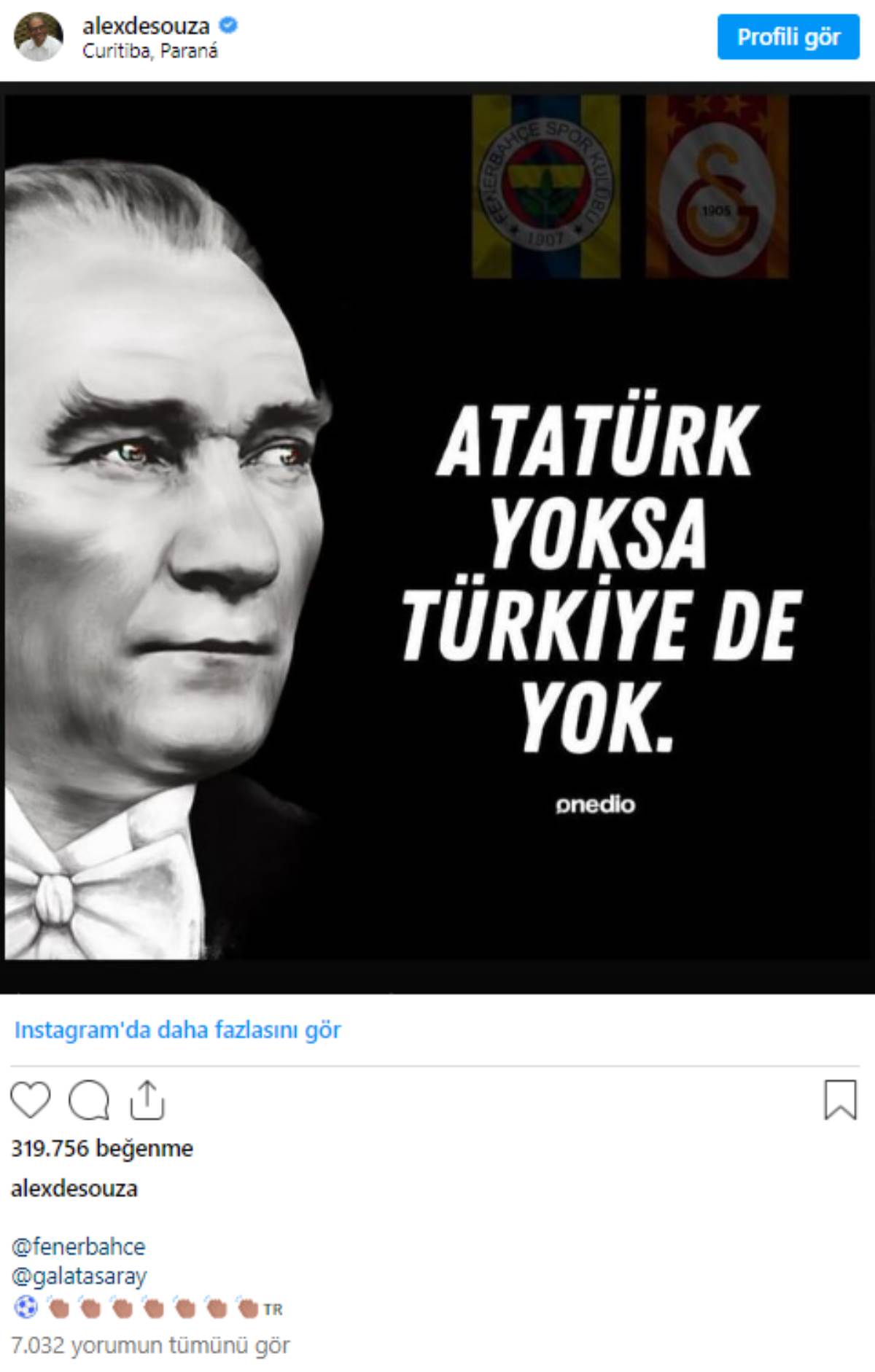 Brezilyalı yıldız, Instagram hesabından Türkiye Cumhuriyeti’nin kurucusu Mustafa Kemal Atatürk’ün fotoğrafını paylaşarak “Atatürk yoksa Türkiye de yok” dedi.