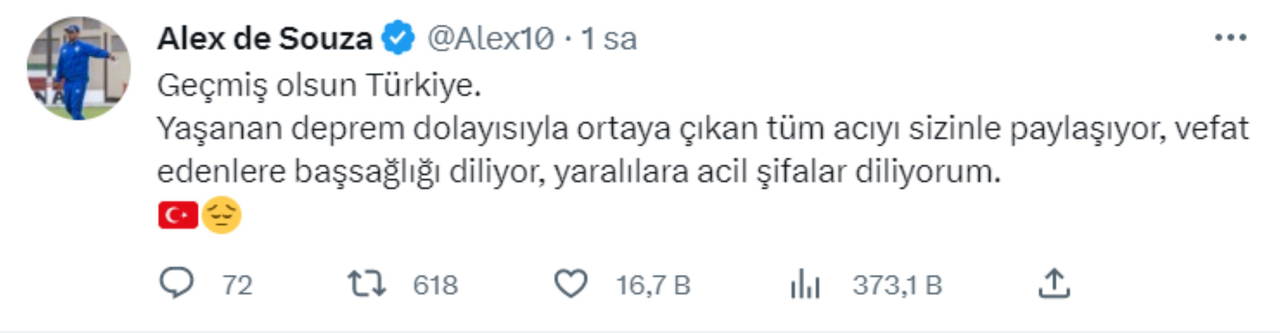 Fenerbahçe'nin efsane futbolcusu Alex de Souza, Kahramanmaraş merkezli yaşanan depremin ardından Türkiye'ye mesaj gönderdi.