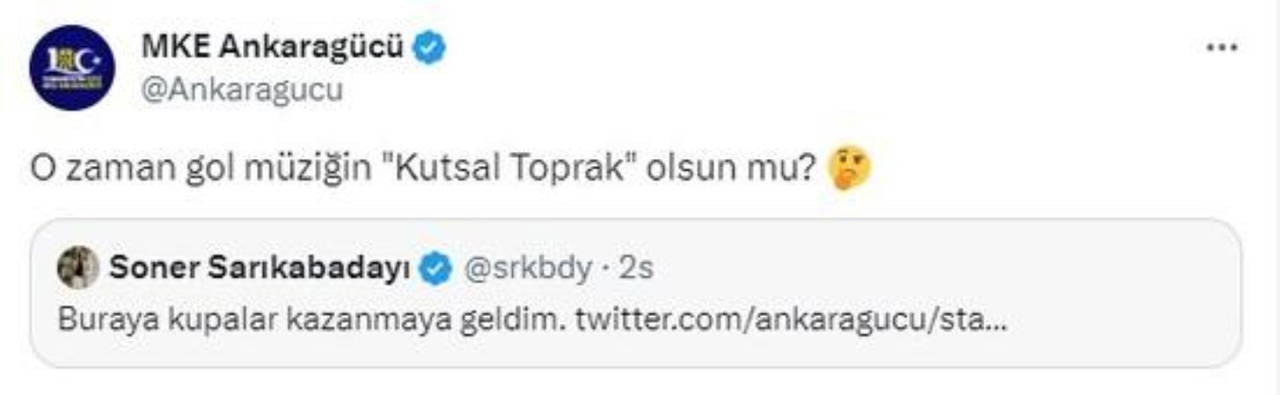 MKE Ankaragücü ise ünlü şarkıcının bu paylaşımına, "O zaman gol müziğin "Kutsal Toprak" olsun mu?" cevabını verdi.