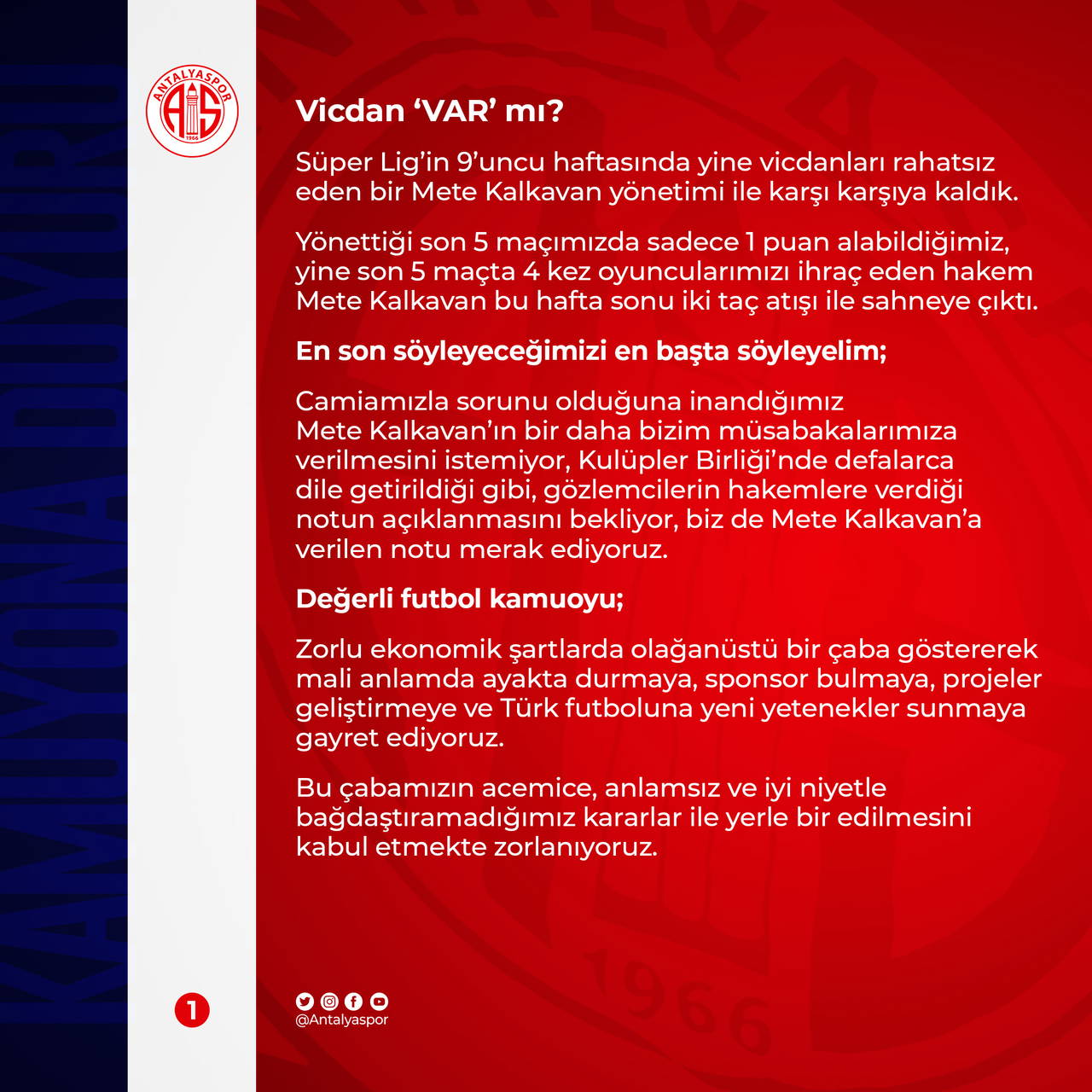 "Önleyici hakemlik uygulamasından uzak, kontrolü ve konsantrasyonu belli ki kaybolmuş bir hakem uygulaması gördük ve arkasından rakibimizin golü geldi. Yetmedi; 45+4’üncü dakika oynanırken maçın hakemi Mete Kalkavan, taç atışını lehimize verdiğinde oyuncularımızın kimi durdu, kimi ileriye doğru hamle yaptı. Ancak anlık bir kararla atış el değiştirildi, hakem kontrolü tamamen kaybetti. Devamında da eksik yakalanan takımımız golü yedi. Değerli futbol kamuoyu; Bizler yenildiğimiz maçlarda bile iyi yönetim gösteren hakemi TFF’ye resmi yazı yazarak kutlamış bir camiayız. Çok uzağa gitmeden, bu sene kazandığımız Çaykur Rizespor maçını yöneten hakemin hala maç alamamış olmasını destekleyen bir anlayışa sahibiz. Bizler hak ettiğimizden fazlasının başkasının hakkı olduğunu bilecek kadar onurlu duruş gösteren bir camiayız. Fakat bizim artık sahadaki adalete olan inancımız kayboldu. Her fırsatta dile getirdiğimiz gibi, hakemlerden önce MHK sisteminin değişmesi gerektiğine olan inancımızı tekrarlıyoruz." Antalyaspor TFF'ye konuyla ilgili bir yazı da gönderdi.
