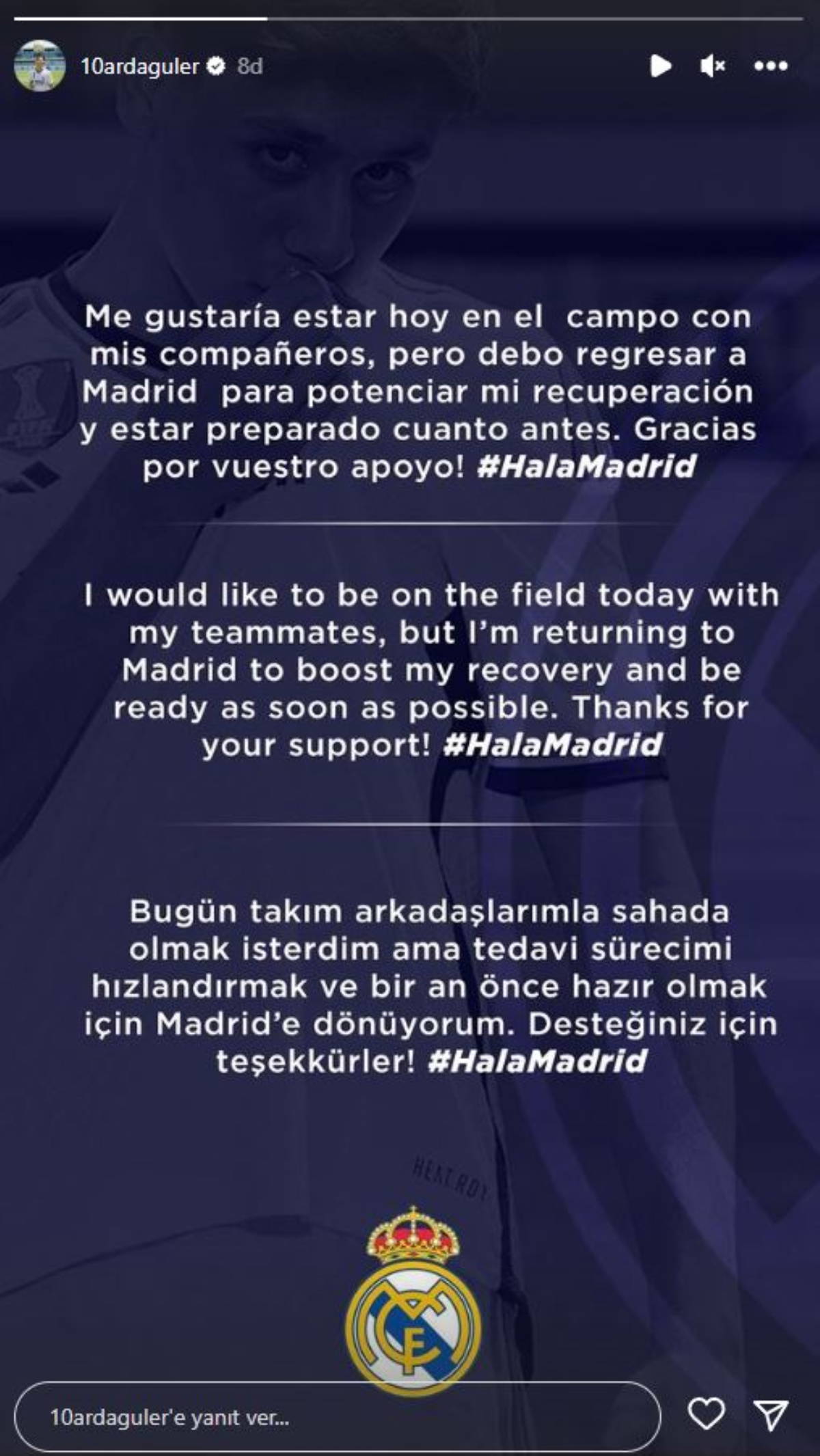 "Bugün takım arkadaşlarımla sahada olmak isterdim ama tedavi sürecimi hızlandırmak ve bir an önce hazır olmak için Madrid'e dönüyorum. Desteğiniz için teşekkürler."