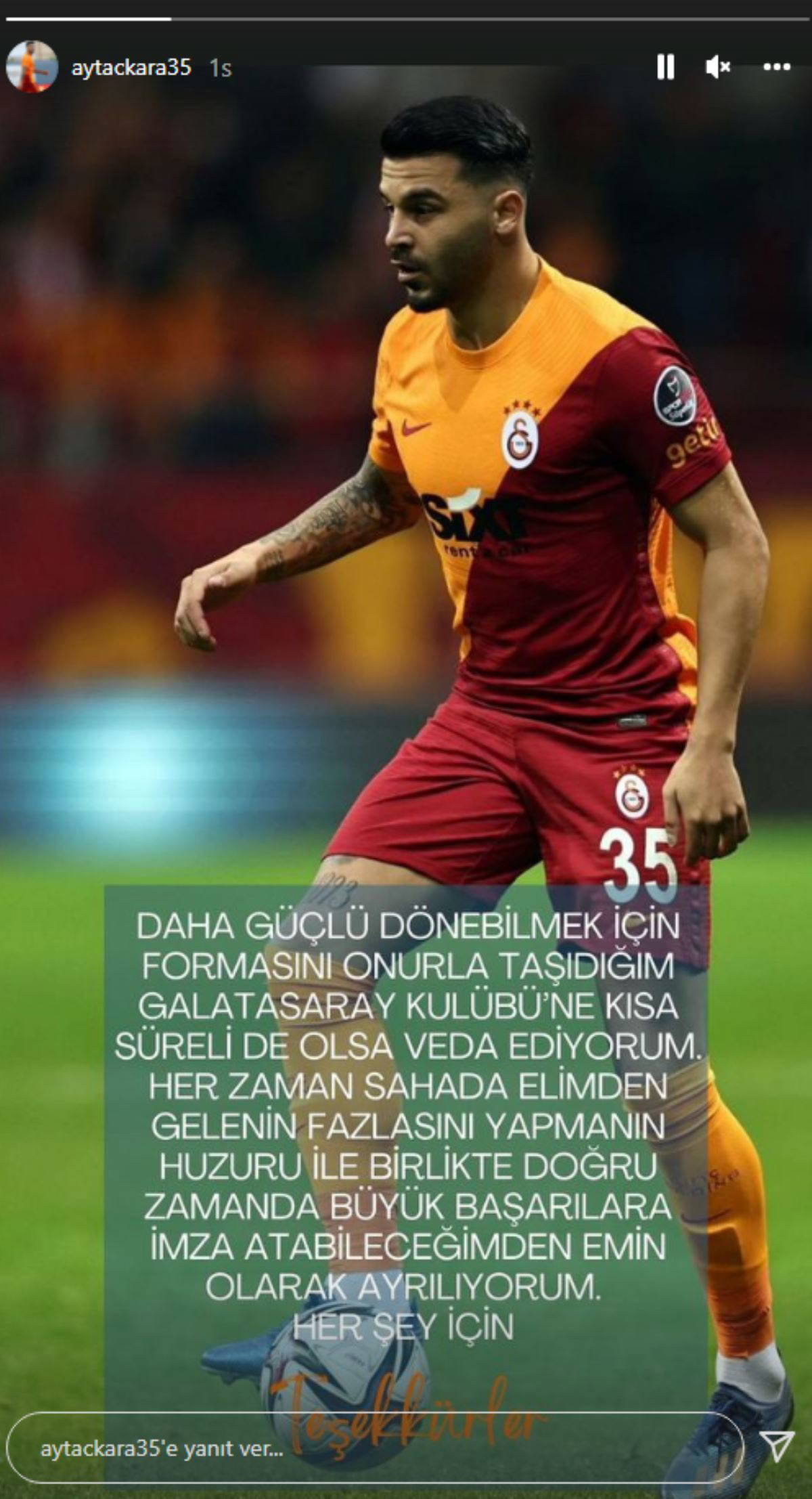"Daha güçlü dönebilmek için formasını onurla taşıdığım Galatasaray Kulübü'ne kısa süreli de olsa veda ediyorum. Her zaman sahada elimden gelenin fazlasını yapmanın huzuru ile birlikte doğru zamanda büyük başarılara imza atabileceğimden emin olarak ayrılıyorum. Her şey için teşekkürler."