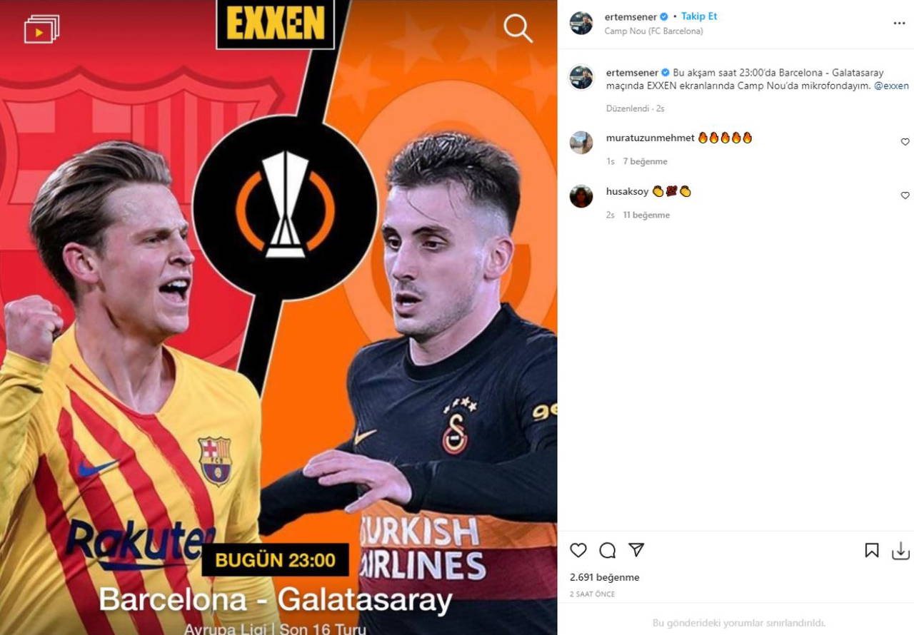 Mücadeleye saatler kala, EXXEN'de maçı anlatacak spiker belli oldu. Barcelona-Galatasaray maçını Ertem Şener anlatacak. Yorumcu ise Ömer Üründül olacak. Şener, bu haberi sosyal medyadan "Bu akşam saat 23:00’da Barcelona - Galatasaray maçında EXXEN ekranlarında Camp Nou’da mikrofondayım" cümleleriyle duyurdu.