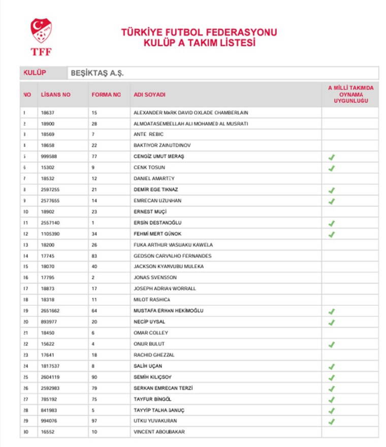 Beşiktaş'ın TFF'ye bildirdiği liste şu şekilde: