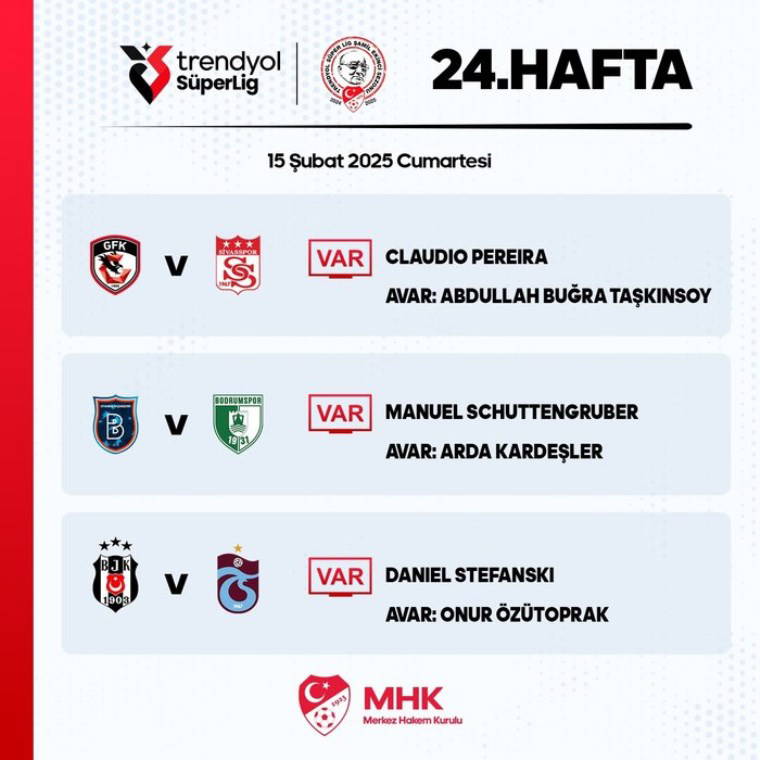 Süper Lig'in 24. haftasında bugün oynanacak maçların VAR hakemleri açıklandı.