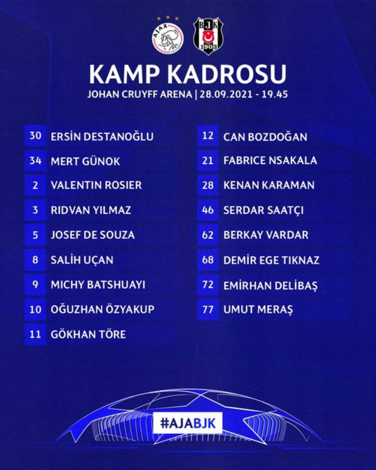 BEŞKTAŞ'IN AJAX MAÇI KADROSU