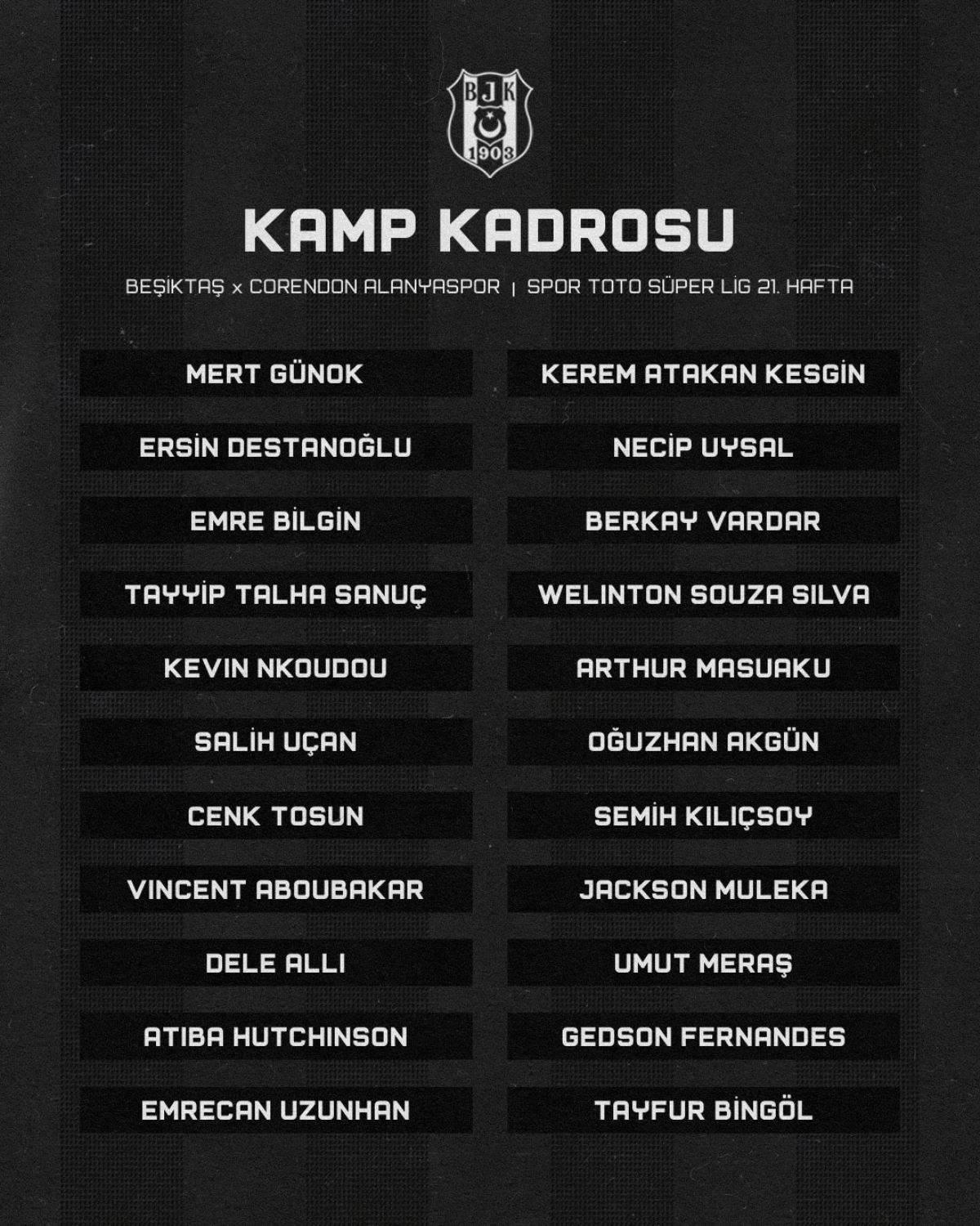 Beşiktaş'ın kamp kadrosu şu şekilde: