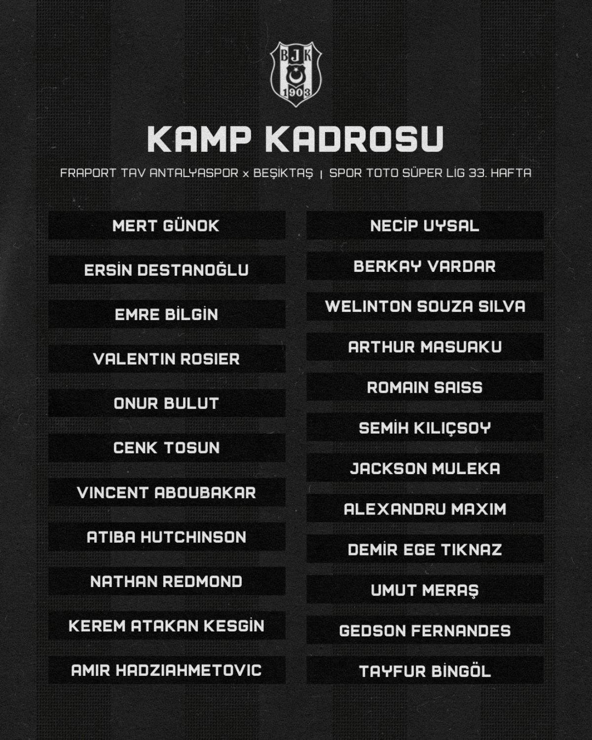 Spor Toto Süper Lig'in 33 haftasında Beşiktaş, yarın saat 19.00'da deplasmanda Antalyaspor ile karşılaşacak. Siyah-beyazlılarda bu maçın kamp kadrosu belli oldu.