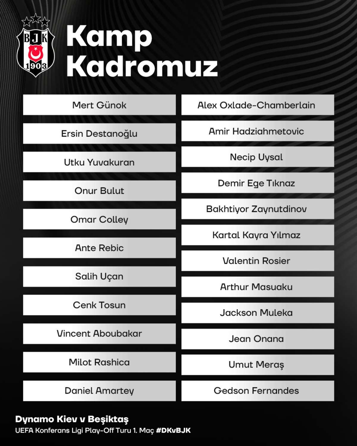 Beşiktaş, 24 Ağustos Perşembe günü UEFA Konferans Ligi play-off turunda Dinamo Kiev ile oynayacağı maçın kadrosunu açıkladı.