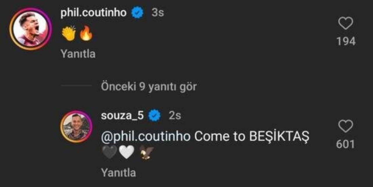 Sosyal medya hesabından paylaştığı fotoğrafa yorumda bulunan Coutinho'ya Josef de Souza'nın 'Come to Beşiktaş' yanıtını vermesi gündem oldu.