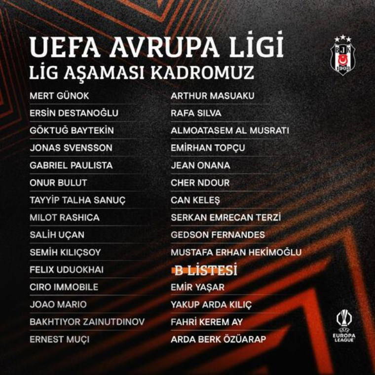 Beşiktaş, UEFA Avrupa Ligi grup aşaması için kadrosunu açıkladı.
