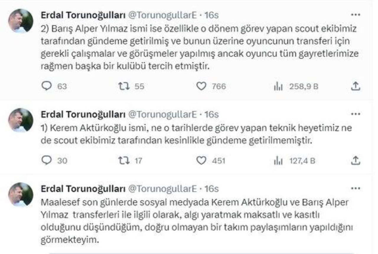 Erdal Torunoğulları yaptığı açıklamada Kerem Aktürkoğlu ile ilgilenmediklerini söyledi. Torunoğulları, "Kerem Aktürkoğlu ismi ne o tarihlerde görev yapan teknik heyetimiz ne de scout ekibimiz tarafından kesinlikle gündeme getirilmemiştir" dedi.