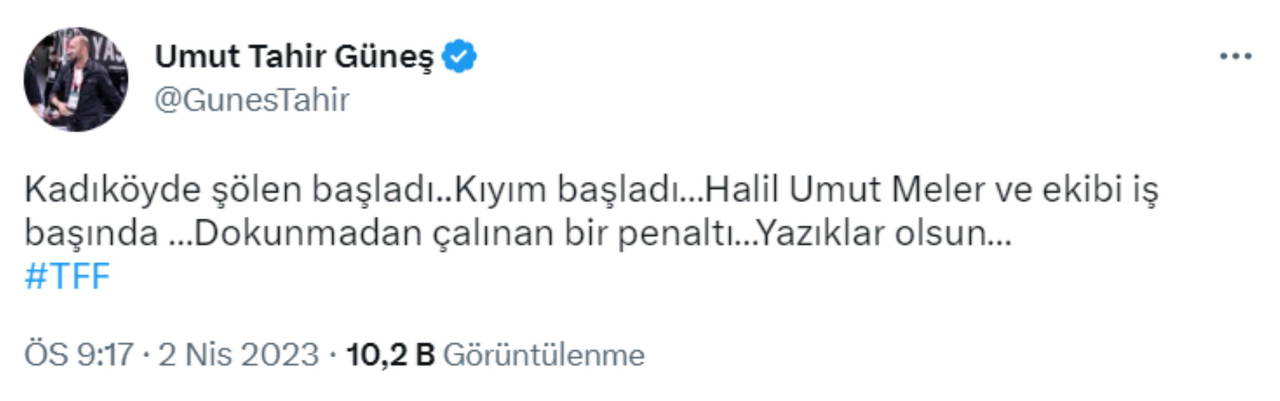 Umut Tahir Güneş, "Kadıköy'de şölen başladı.. Kıyım başladı… Halil Umut Meler ve ekibi iş başında… Dokunmadan çalınan bir penaltı… Yazıklar olsun…" ifadelerini kullandı.