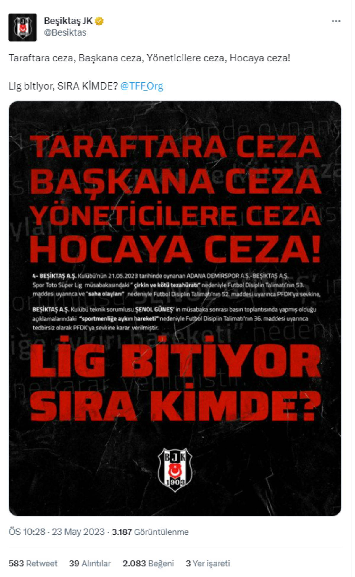 Siyah beyazlılar tarafından yapılan paylaşımda, "Taraftara ceza, Başkana ceza, Yöneticilere ceza, Hocaya ceza! Lig bitiyor, SIRA KİMDE?" ifadeleri kullandı.