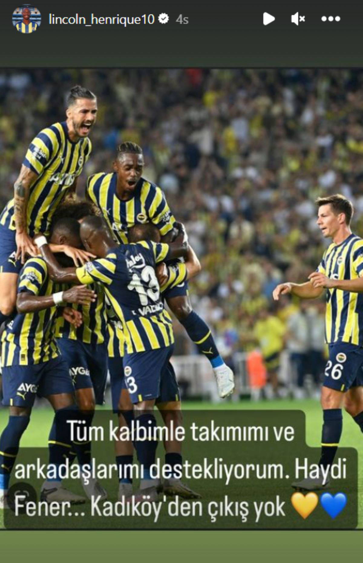 Sakatlığı nedeniyle sahalardan uzak kalan Lincoln, paylaşımında, "Tüm kalbimle takımımı ve arkadaşlarımı destekliyorum. Haydi Fener... Kadıköy'den çıkış yok" ifadelerini kullandı. Brezilyalı futbolcu bu paylaşımına sarı ve lacivert kalp emojleri de ekledi.