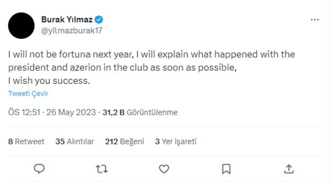 Burak Yılmaz, "Seneye Fortuna'da olmayacağım. En kısa zamanda başkan ve yönetimle yaşananları anlatacağım. Sizlere başarılar diliyorum" ifadelerini kullandı.