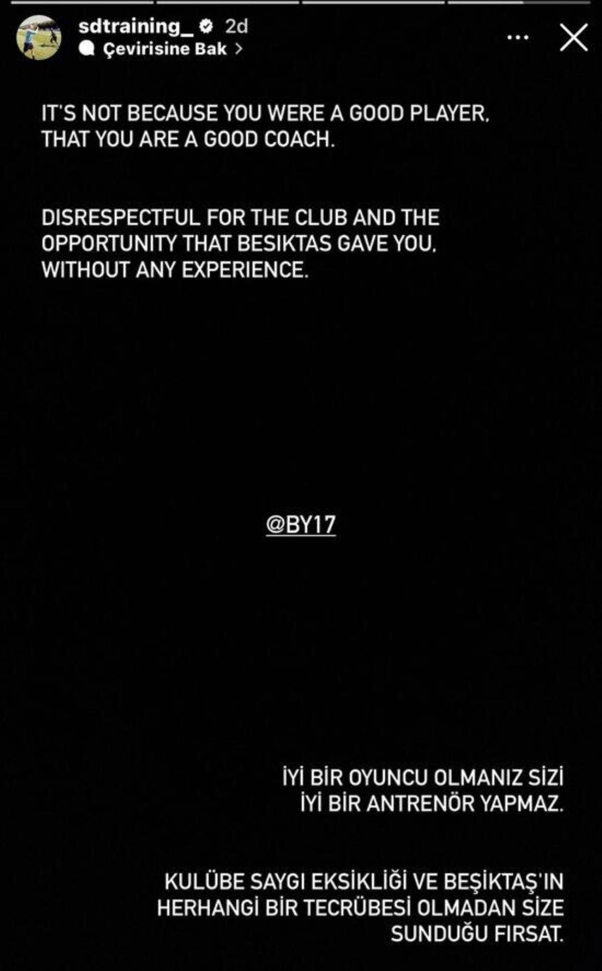 Yaptığı paylaşımda Burak Yılmaz'ı etiketleyen Demirel, "İyi bir oyuncu olmanız sizi iyi bir antrenör yapmaz. Beşiktaş'ın herhangi bir tecrübeniz olmamasına rağmen size sunduğu fırsata karşı büyük bir saygı eksikliği" ifadelerini kullandı.