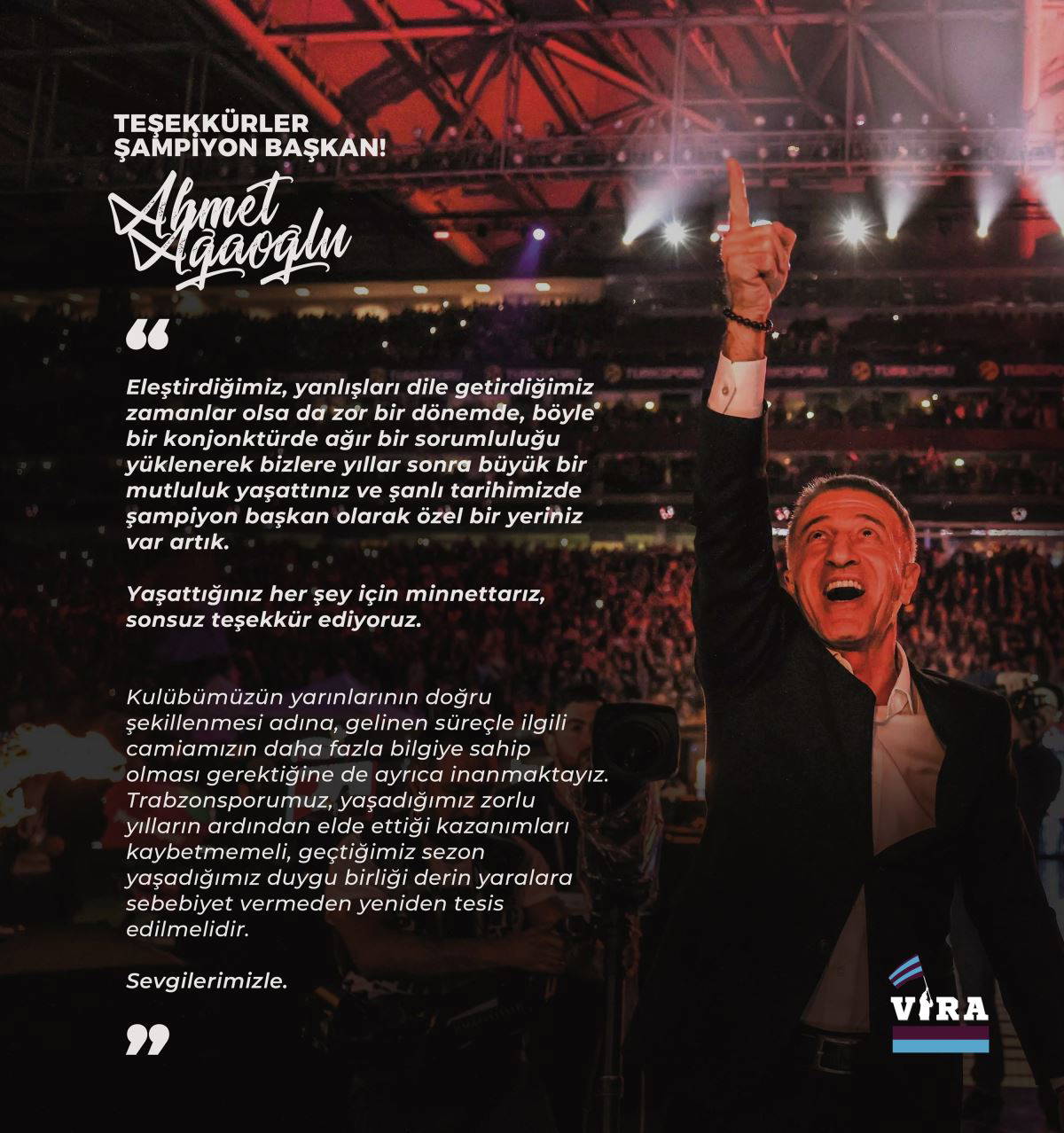 Trabzonspor taraftarları da, başkanlık görevini bırakan Ahmet Ağaoğlu’na sosyal medya hesaplarından mesajı paylaşımlarında bulundu. ‘Vira’ taraftar grubu; “Eleştirdiğimiz, yanlışları dile getirdiğimiz zamanlar olsa da zor bir dönemde, böyle bir konjonktürde ağır bir sorumluluğu yüklenerek bizlere yıllar sonra büyük bir mutluluk yaşattınız ve şanlı tarihimizde şampiyon başkan olarak özel bir yeriniz var artık. Yaşattığınız her şey için minnettarız, sonsuz teşekkür ediyoruz. Kulübümüzün yarınlarının doğru şekillenmesi adına, gelinen süreçle ilgili camiamızın daha fazla bilgiye sahip olması gerektiğine de ayrıca inanmaktayız. Trabzonspor’umuz, yaşadığımız zorlu yılların ardından elde ettiği kazanımları kaybetmemeli, geçtiğimiz sezon yaşadığımız duygu birliği derin yaralara sebebiyet vermeden yeniden tesis edilmelidir” mesajını paylaştı.