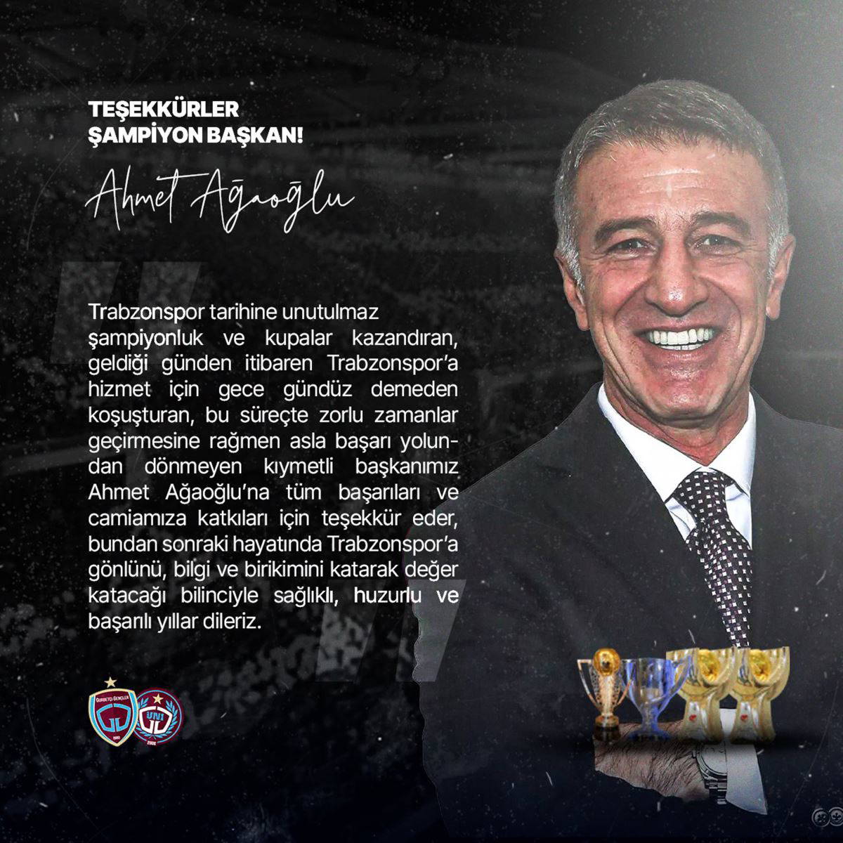 Taraftar gruplarından ‘Gurbetçi Gençler’’in yayınladığı mesajda ise, “Trabzonspor tarihine unutulmaz şampiyonluk ve kupalar kazandıran, geldiği günden itibaren Trabzonspor’a hizmet için gece gündüz demeden koşuşturan, bu süreçte zorlu zamanlar geçirmesine rağmen asla başarı yolundan dönmeyen kıymetli başkanımız Ahmet Ağaoğlu’na tüm başarıları ve camiamıza katkıları için teşekkür eder, bundan sonraki hayatında Trabzonspor’a gönlünü, bilgi ve birikimini katarak değer katacağı bilinciyle sağlıklı, huzurlu ve başarılı yıllar dileriz” ifadelerine yer verildi.