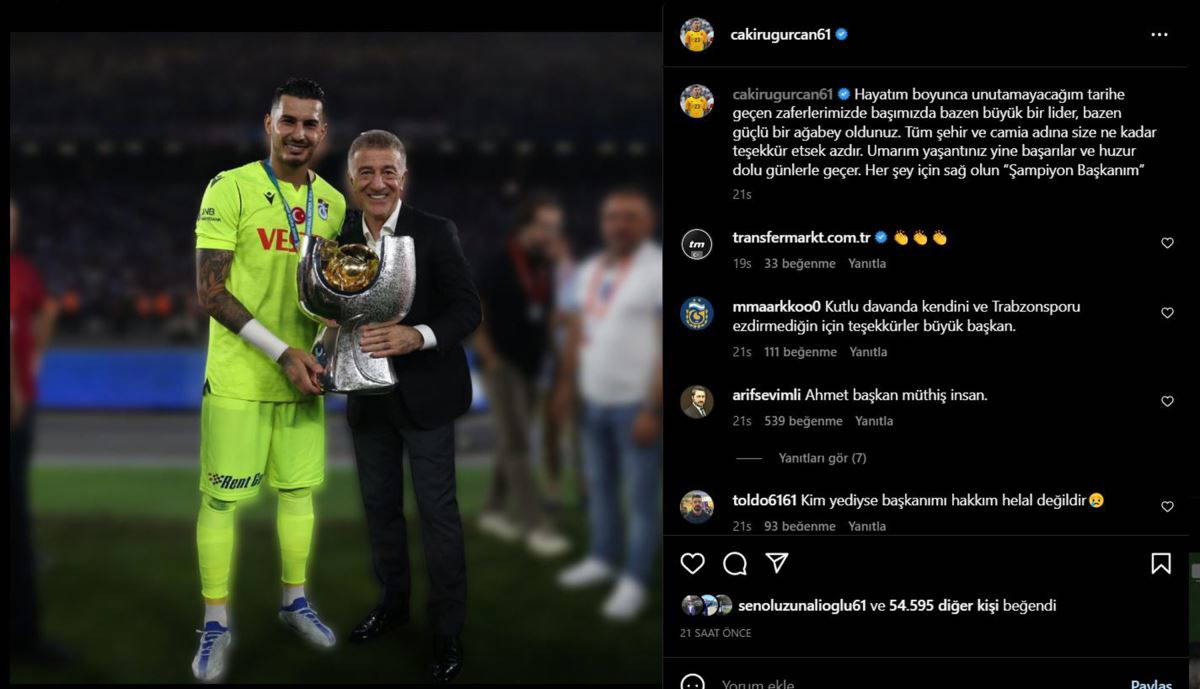 Kulübün altyapısından yetişip, Ağaoğlu döneminde A takımda kendisini daha fazla gösterme şansı bularak kaptanlığa yükselen Uğurcan Çakır, sosyal medya hesabında duygusal bir veda mesajı paylaştı. Çakır, “Hayatım boyunca unutamayacağım, tarihe geçen zaferlerimizde başımızda zaten büyük bir lider, bazen güçlü bir ağabey oldunuz. Tüm şehir ve camia adına size ne kadar teşekkür etsek azdır. Umarım yaşantınız yine başarılar ve huzur dolu günlerle geçer. Her şey için sağolun Şampiyon Başkanım” ifadelerini kullandı.