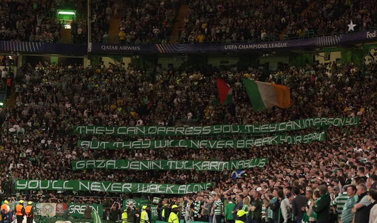 İç sahada oynanan birçok karşılaşmada İsrail işgali altındaki Filistin'e destek veren yeşil-beyazlı takımın taraftarları, Celtic Park ev sahipliğindeki Slovan Bratislava mücadelesinde de açtıkları pankart ve bayraklarla desteğini sürdürdü.