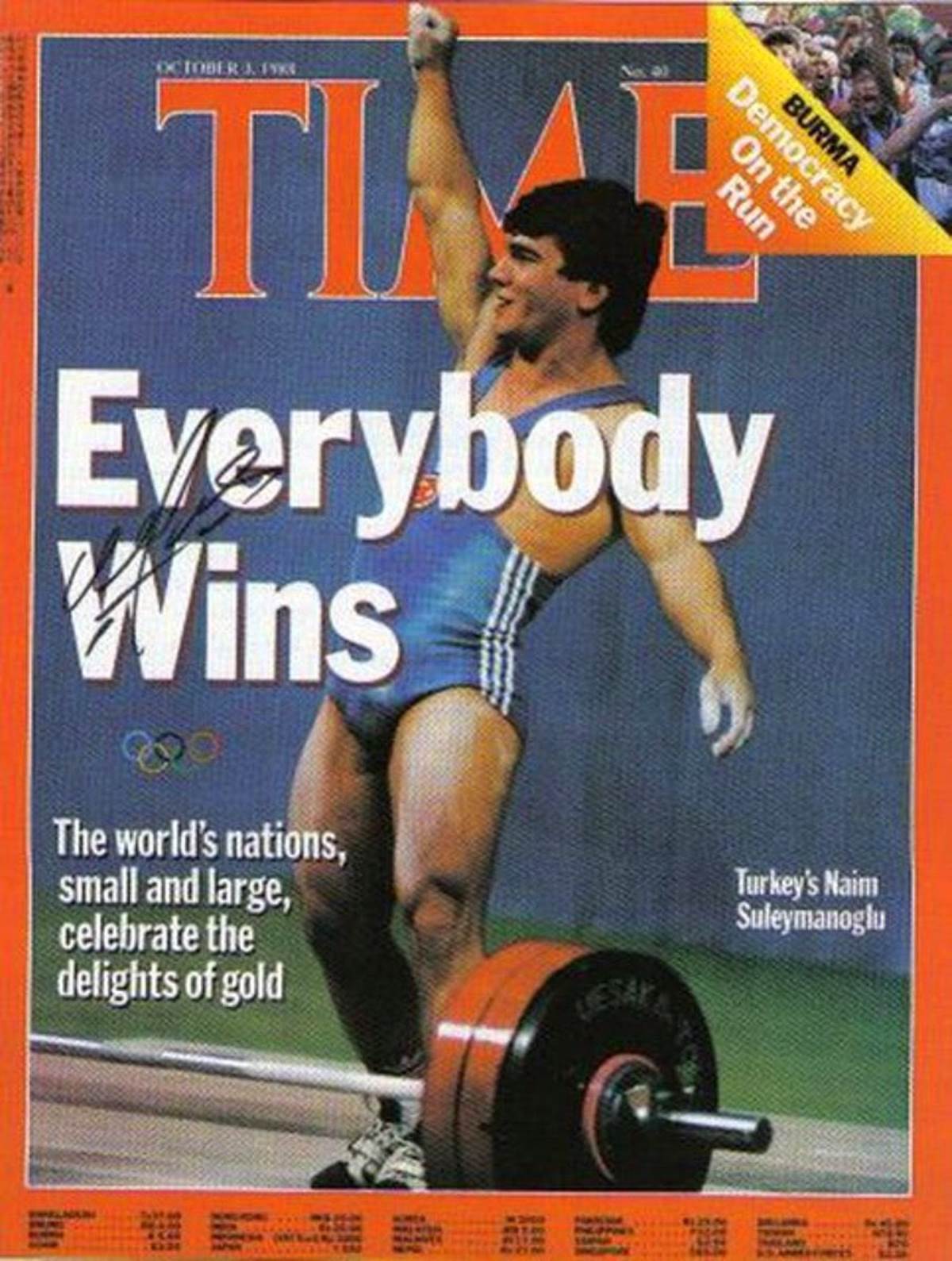 1988 Seul Olimpiyatları'nda 6 dünya, 9 olimpiyat rekoru kıran ve "Dünyanın en iyi haltercisi" seçilen Naim Süleymanoğlu, 3 Ekim 1988'de "Everybody Wins" başlığıyla Time dergisine kapak oldu.