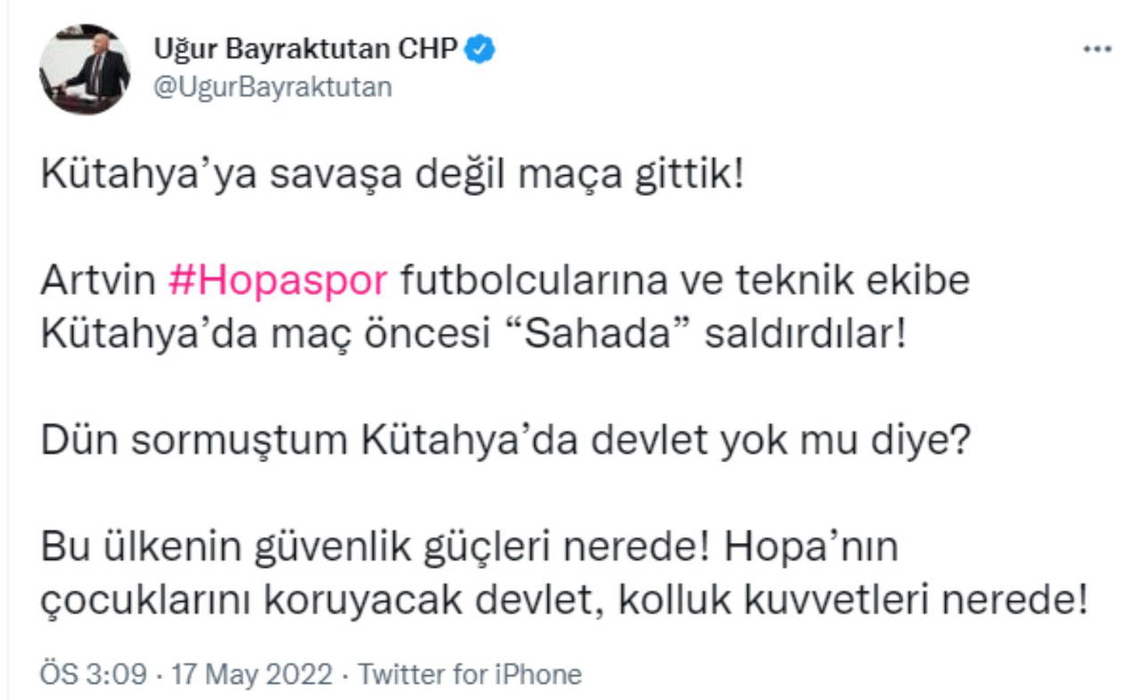 Maça dakikalar kala CHP'li Uğur Bayraktutan, kişisel sosyal medya hesabından bir paylaşımda bulundu. Bayraktutan, "Kütahya’ya savaşa değil maça gittik! Artvin Hopaspor futbolcularına ve teknik ekibe Kütahya’da maç öncesi sahada saldırdılar! Dün sormuştum Kütahya’da devlet yok mu diye? Bu ülkenin güvenlik güçleri nerede! Hopa’nın çocuklarını koruyacak devlet, kolluk kuvvetleri nerede!" ifadelerini kullandı. Bayraktutan tweetini kısa süre içerisinde sildi.