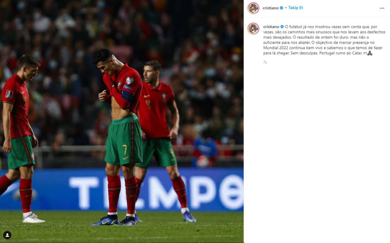 Yaptığı paylaşımda Dünya Kupası'na katılmak için ne yapmaları gerektiğini bildiğini ifade eden yıldız futbolcu, "Futbol bize yeniden gösterdi ki; en çok istediğiniz sonuca ulaşmak için en dolambaçlı yollardan gitmelisiniz. Dün akşam aldığımız sonuç üzücüydü ama bizi alt etmeye yetmedi. Dünya Kupası hedefimiz hala çok canlı ve katılmak için ne yapmamız gerektiğini biliyoruz. Bahane yok; Portekiz, Katar'a gidecek." ifadelerini kullandı.