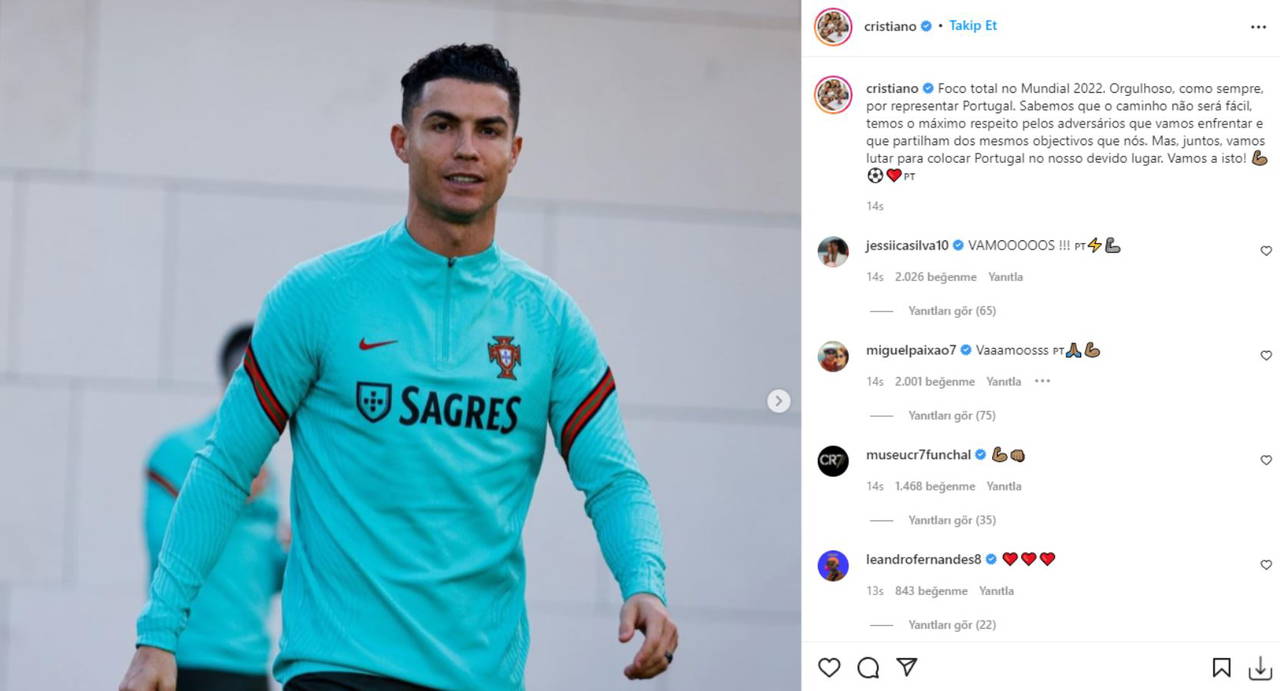 Ronaldo resmi Instagram hesabından yaptığı maç öncesi paylaşımda, "2022 Dünya Kupası'na tamamen odaklanın. Her zaman olduğu gibi Portekiz'i temsil etmekten gurur duyuyorum. Yolun kolay olmayacağını biliyoruz, karşılaşıcağımız ve bizimle aynı hedefleri olan rakiplere saygımız sonsuz. Birlikte Portekiz'i hak ettiği yere koymak için savaşacağız. Haydi yapalım şunu!" ifadelerini kullandı.