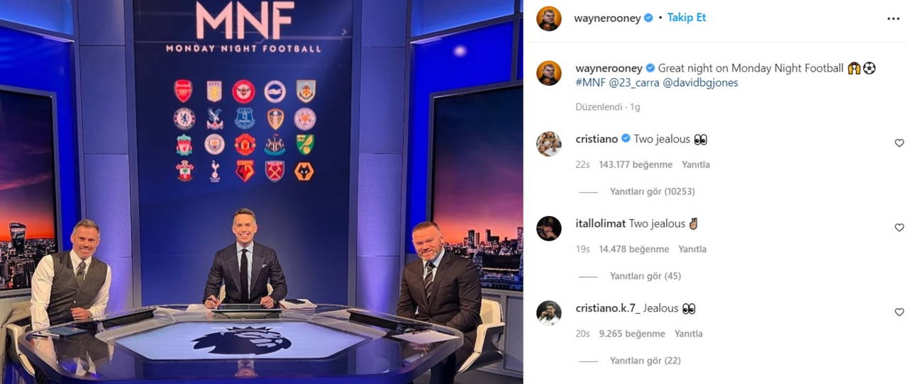 Katıldığı programdaki sunucu David Jones ve eski futbolcu Jamie Carragher ile çekilen bir fotoğrafını paylaşan Rooney’e, Ronaldo’dan yanıt gecikmedi.