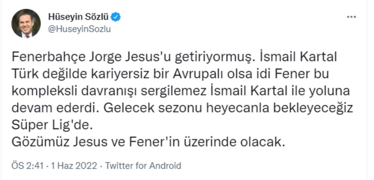 "Fenerbahçe Jorge Jesus'u getiriyormuş. İsmail Kartal Türk değilde kariyersiz bir Avrupalı olsa idi Fener bu kompleksli davranışı sergilemez İsmail Kartal ile yoluna devam ederdi. Gelecek sezonu heyecanla bekleyeceğiz Süper Lig'de. Gözümüz Jesus ve Fener'in üzerinde olacak."