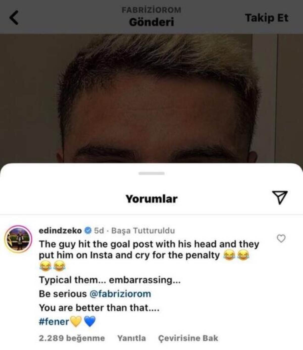 Dzeko yaptığı paylaşımda, "Adam kafasını direğe vurdu ve onu Instagram'a koyup penaltı için ağladılar. Onların tipik davranışı. Utanç verici. Her zamanki halleri. Fabrizio, sen de bundan daha iyisini yapabilirsin" ifadelerini kullandı.