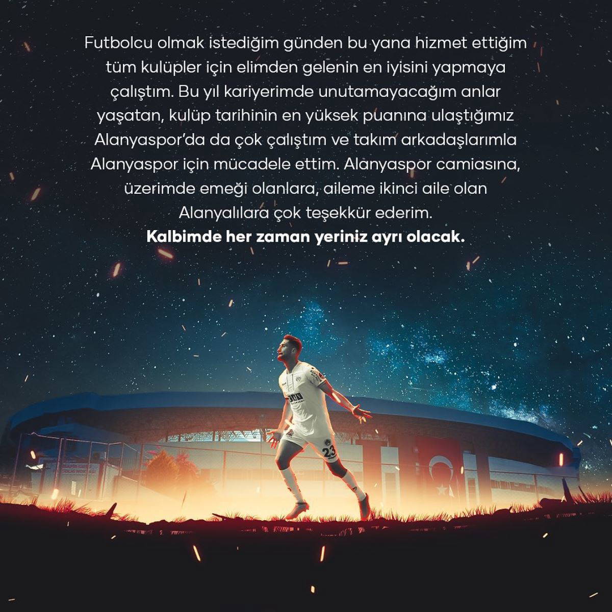 "Futbolcu olmak istediğim günden bu yana hizmet ettiğim tüm kulüpler için elimden gelenin en iyisini yapmaya çalıştım. Bu yıl kariyerimde unutamayacağım anlar yaşatan, kulüp tarihinin en yüksek puanına ulaştığımız Alanyaspor'da da çok çalıştım ve takım arkadaşlarımla Alanyaspor için mücadele ettim. Alanyaspor camiasına, üzerimde emeği olanlara, aileme ikinci aile olan Alanyalılara çok teşekkür ederim. Kalbimde her zaman yeriniz ayrı olacak."