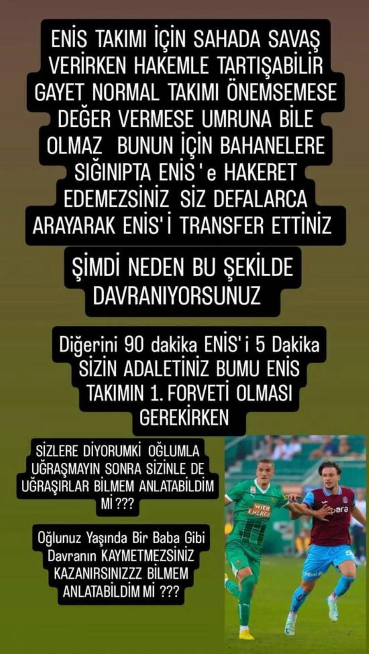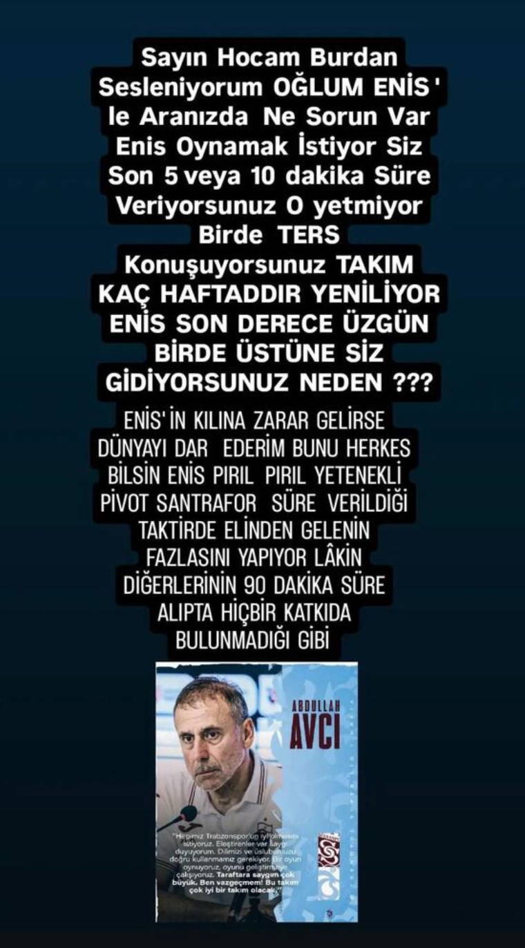 Trabzonspor'un genç oyuncusu Enis Destan'ın annesi Gül Destan, teknik direktör Abdullah Avcı hakkında çok sert bir paylaşım yaptı.