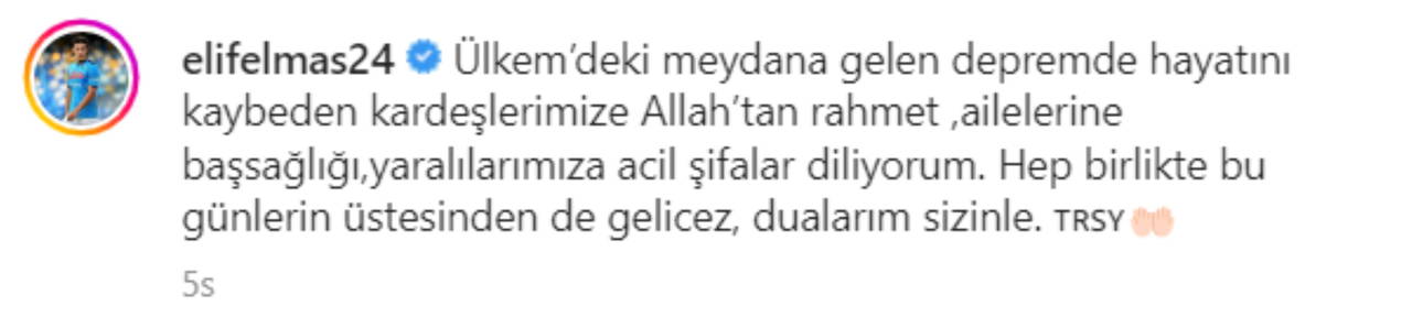 Elmas, depremden etkilenen Türkiye ve Suriye'nin bayraklarıyla Türkçe paylaştığı gönderisinde, "Ülkem'deki meydana gelen depremde hayatını kaybeden kardeşlerimize Allah'tan rahmet, ailelerine başsağlığı, yaralılarımıza acil şifalar diliyorum. Hep birlikte bu günlerin üstesinden de geleceğiz, dualarım sizinle" ifadelerini kullandı.