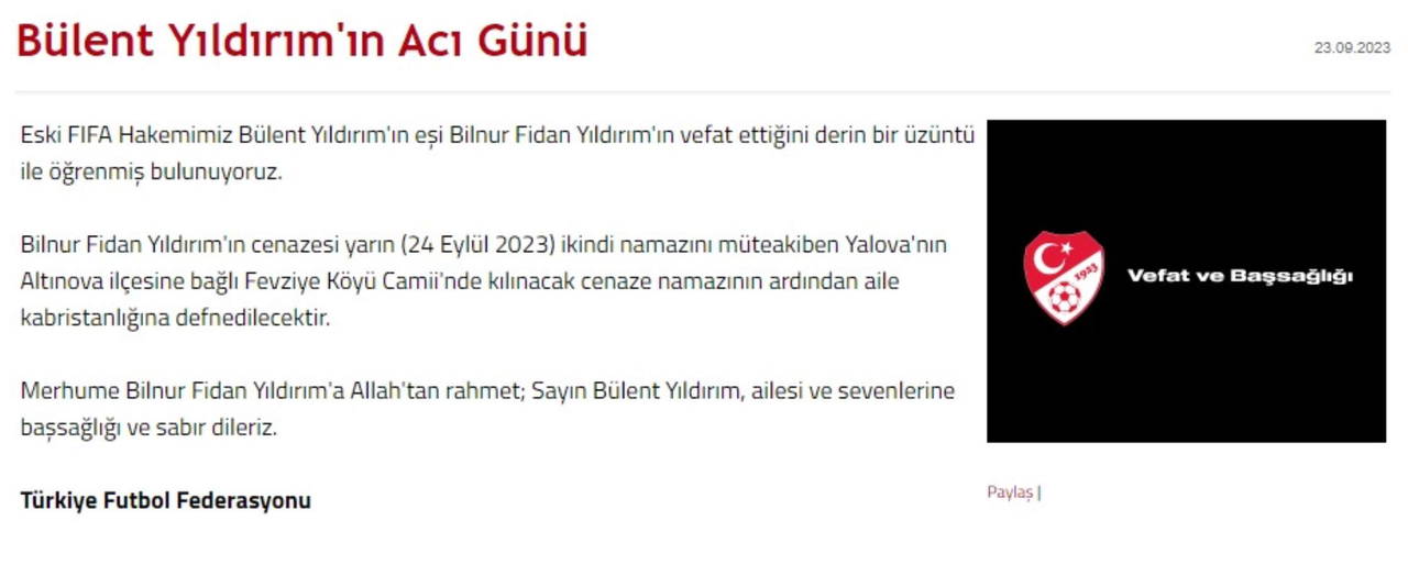 TFF’nin internet sitesinden yayımlanan mesajda, "Eski FIFA Hakemimiz Bülent Yıldırım’ın eşi Bilnur Fidan Yıldırım’ın vefat ettiğini derin bir üzüntü ile öğrenmiş bulunuyoruz. Bilnur Fidan Yıldırım’ın cenazesi yarın ikindi namazını müteakiben Yalova’nın Altınova ilçesine bağlı Fevziye Köyü Camii’nde kılınacak cenaze namazının ardından aile kabristanlığına defnedilecektir. Merhume Bilnur Fidan Yıldırım’a Allah’tan rahmet; Sayın Bülent Yıldırım, ailesi ve sevenlerine başsağlığı ve sabır dileriz" ifadeleri kullanıldı.
