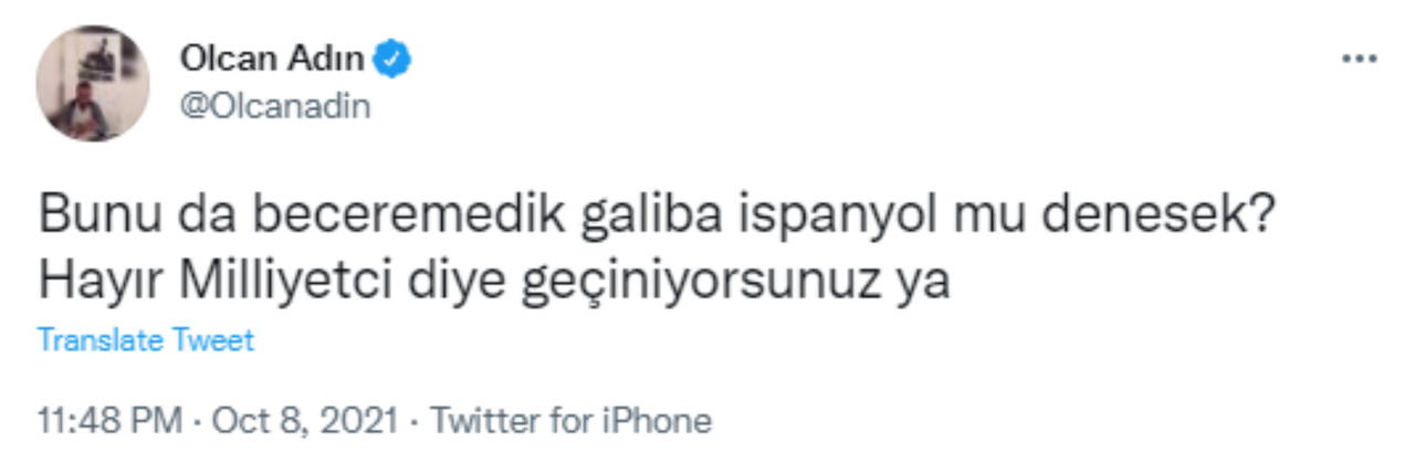 1 puana razı olarak son 3 maç kala işini zora sokan A Milli Takım’da Alman teknik direktör Kuntz, takımın başındaki ilk maçında beklenen performansı gösteremedi. Maçın bitiminin ardından sosyal medya hesabından bir paylaşım yapan eski futbolcu Olcan Adın, ”Bunu da beceremedik galiba. İspanyol mu denesek? Hayır milliyetçi diye geçiniyorsunuz ya” ifadelerini kullandı.