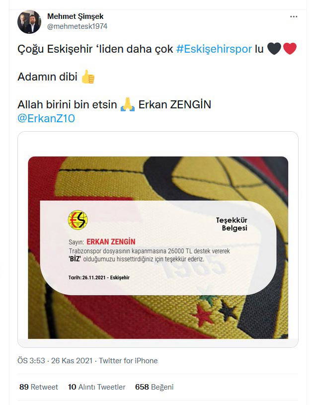 Eskişehirspor’un eski oyuncularından Erkan Zengin de kulübe 26 bin liralık bağışta bulundu. Eskişehirspor Kulübü Başkanı Mehmet Şimşek, Zengin’in bağışını sosyal medyada paylaştı. Şimşek, bağışın altına da “Çoğu Eskişehirliden daha çok Eskişehirsporlu. Allah birini bin etsin, Erkan Zengin” diye yazdı.