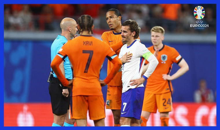 Fransa'da yıldız oyuncu Antoine Griezmann karşı karşıya iki net pozisyondan yararlanamazken, Hollanda'da Xavi Simons'un 69. dakikada attığı gol ofsayt gerekçesiyle geçerlilik kazanmadı.