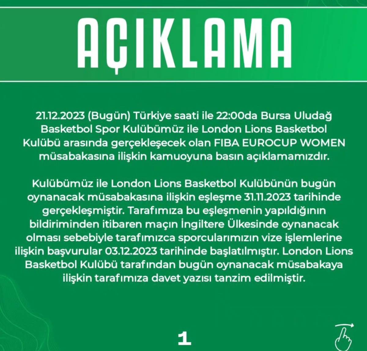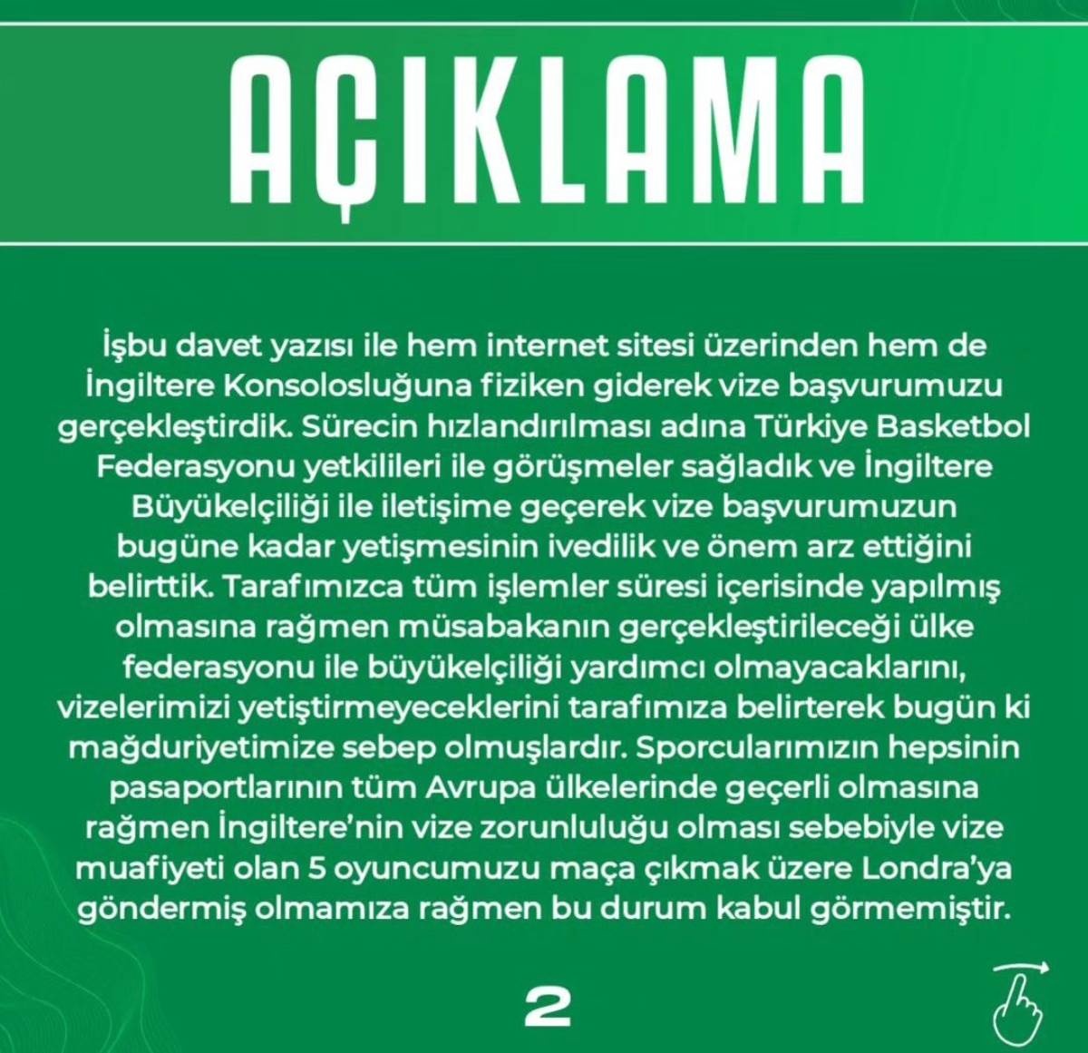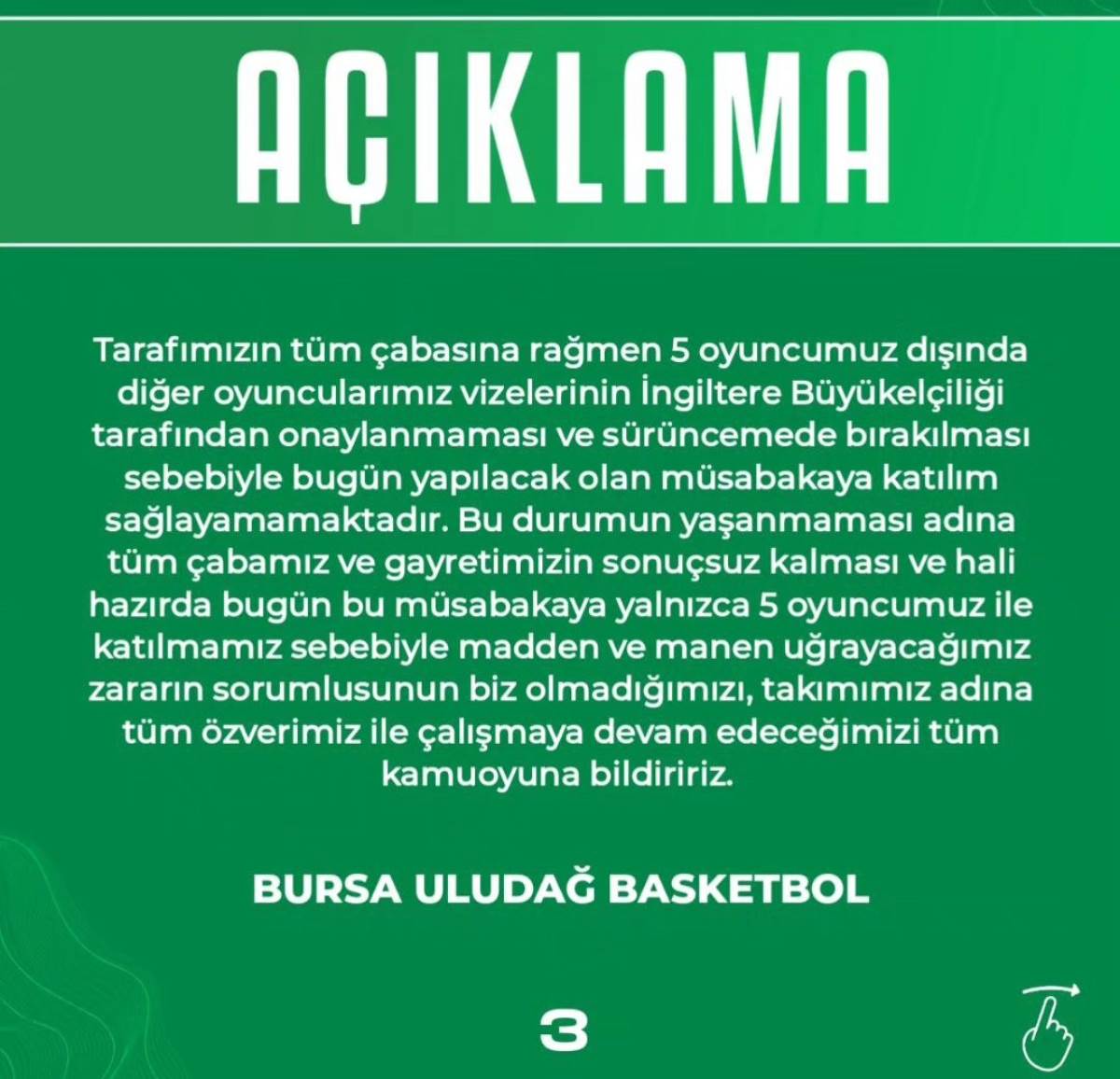 "Tarafımızca tüm işlemler süresi içerisinde yapılmış olmasına rağmen müsabakanın gerçekleştirileceği ülke federasyonu ile büyükelçiliği yardımcı olmayacaklarını, vizelerimizi yetiştirmeyeceklerini tarafımıza bildirerek bugünkü mağduriyetimize sebep olmuşlardır. Sporcularımızın hepsinin pasaportlarının tüm Avrupa ülkelerinde geçerli olmasına, İngiltere'nin vize zorunluluğu bulunması sebebiyle vize muafiyeti olan 5 oyuncumuzu maça çıkmak üzere Londra'ya göndermiş olmamıza rağmen, bu durum kabul görmemiştir. Tüm çabamıza rağmen 5 oyuncumuz dışında diğer oyuncularımızın vizelerinin İngiltere Büyükelçiliği tarafından onaylanmaması ve sürüncemede bırakılması sebebiyle bugün yapılacak olan müsabakaya takımımız katılım sağlayamamaktadır. Bu durumun yaşanmaması adına tüm çabamızın ve gayretimizin sonuçsuz kalması, hali hazırda bugün müsabakaya yalnız 5 oyuncumuz ile katılmamız sebebiyle madden ve manen uğrayacağımız zararın sorumlusunun biz olmadığımızı, takımımız adına tüm özveri ile çalışmaya devam edeceğimizi tüm kamuoyuna bildiririz."